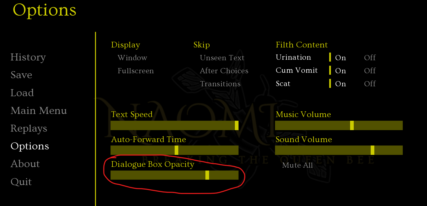 First off, having "text box opacity" is always a good idea for any game IMO.